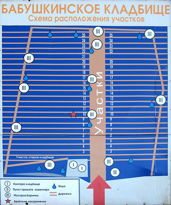 Бабушкинское кладбище располагается в Северо-восточном административном округе Москвы и занимает площадь свыше 11 гектар. Кладбище находится в хозяйственном ведении ГУП «Ритуал». Бабушкинское кладбище открыто для посещений ежедневно с мая по сентябрь с 9 часов до 19 часов и с октября по апрель с 9 часов до 17 часов. Захоронения на Бабушкинском кладбище производятся ежедневно с 9 часов до 17 часов. Бабушкинское кладбище образовано в 1913 году рядом с городом Лосиноостровск, который в последствии был переименован в город Бабушкин. В 1960 году кладбище вошло в административные границы Москвы и включено в список московских кладбищ. Территория бабушкинского кладбища хорошо благоустроена, между участками с захоронениями асфальтированные дорожки, на центральной аллее имеются места для отдыха с лавочками. Рядом с Бабушкинским кладбищем находится Храм мучеников Адриана и Натальи, построенный в 1914-1916 годах. На 10 участке кладбища слева от центральной алеи находится братская могила солдат погибших в Великой отечественной войне. Известные люди, похороненные на Алексеевском кладбище: Гришин Алексей Никонович - Герой Советского Союза, Кучумов Александр Михайлович - Герой Советского Союза, Щербаков Арсентий Арсентьевич - Герой Советского Союза, подполковник, Емельянов Владимир Николаевич - советский актёр, Захарченко Вадим Викторович - советский и российский актёр. На кладбище работает пункт проката инвентаря для ухода за могилами. В настоящее время на Бабушкинском кладбище производятся родственные захоронения, семейные (родовые) захоронения и захоронения урн в землю. Фотографии и описание предоставлены сайтом mos-ritual.ru |
